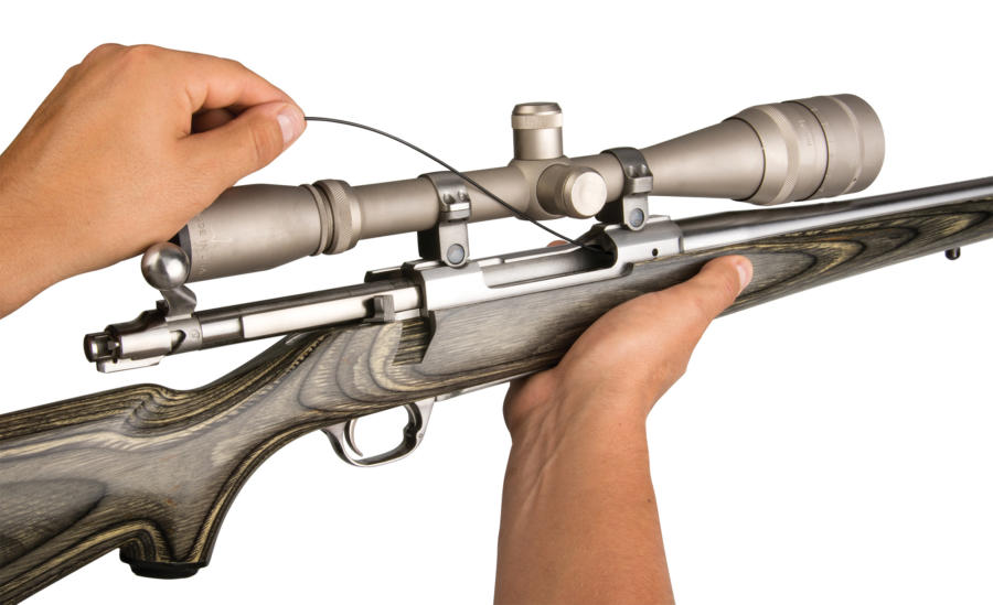 Odviňte ocelovou šňůru z držáku a vložte ji do hlavně pod libovolným úhlem. Připevněte šňůru druhým koncem k háčku na držáku a protáhněte šňůru hlavní. Tomu se říká chytré čištění hlavně.