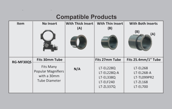Vhodné pro zvětšovací moduly před kolimátory, svítilny, lasery a další příslušenství o průměru 30mm. Balení obsahuje 2 redukce pro 27mm (svítilny apod.) a 1" průměr.