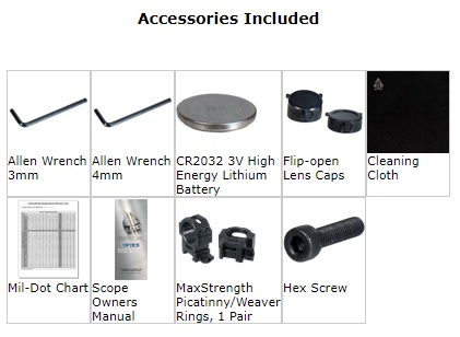 Zaměřovač je vybaven vnějšími sklopnými krytkami objektivu (ACCU-SYNC®), které slouží jako ochrana při manipulaci a přenosu zbraně. Krytkou je opatřena přední i výstupní čočka. Součástí balení je 2x montážní kroužek s rychlomontáží urrčený pro instalaci na Weaver/Picatinny lištu