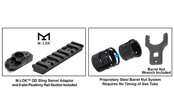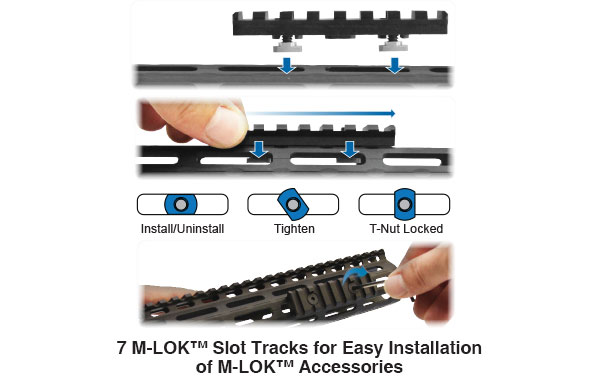 • Zahrnuje 2 příslušenství M-LOK®, 8-slotovou sekci Picatinny lišty pro montáž příslušenství a adaptér pro uchycení rychloupínacího popruhu pro uchycení popruhu, připraveno k použití ihned po vybalení z krabice
