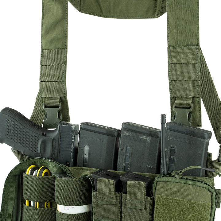 Díky rychloupínacím přezkám po celém obvodu a panelu se suchým zipem na zadní straně rig může být namontován na jakýkoli nosič kompatibilní se systémem Viper Buckle Up. Reverzní panel se suchým zipem může být také použit k připevnění dolní kapsy, jako je Viper VX Dangler nebo Scrote. Na přední straně rig naleznete dvě zipové, univerzální kapsy, dvě elastické kapsy na zásobníky/příslušenství a dva panely se suchým zipem pro identifikaci.